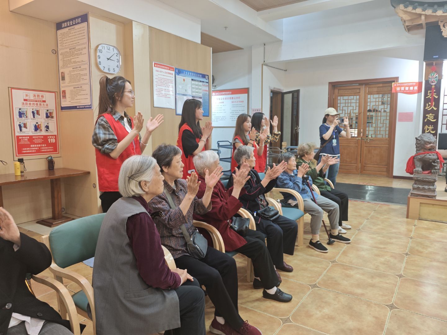 活动伊始,青年志愿者协会工作人员唐峥慧向老人们讲解了常见老年病的预防知识并介绍了养生保健方法,如合理饮食、适度运动等,呼吁老人们把科学养生知识运用到日常生活中。接下来,活动进入游戏环节,其中包括听到水果请举手、抓尾巴、手部保健操,志愿者们踊跃参与游戏并和老人们热情互动。此外,志愿者们还表演了鲜花魔术,将变出的花朵送给了在场的女性并提前祝福她们母亲节快乐。随后,志愿者和老人们共同欢唱,其乐融融。最后,志愿者们与老人们告别,老人们也表示对志愿者们的到来感到开心,并且期待志愿者们的下一次到来。