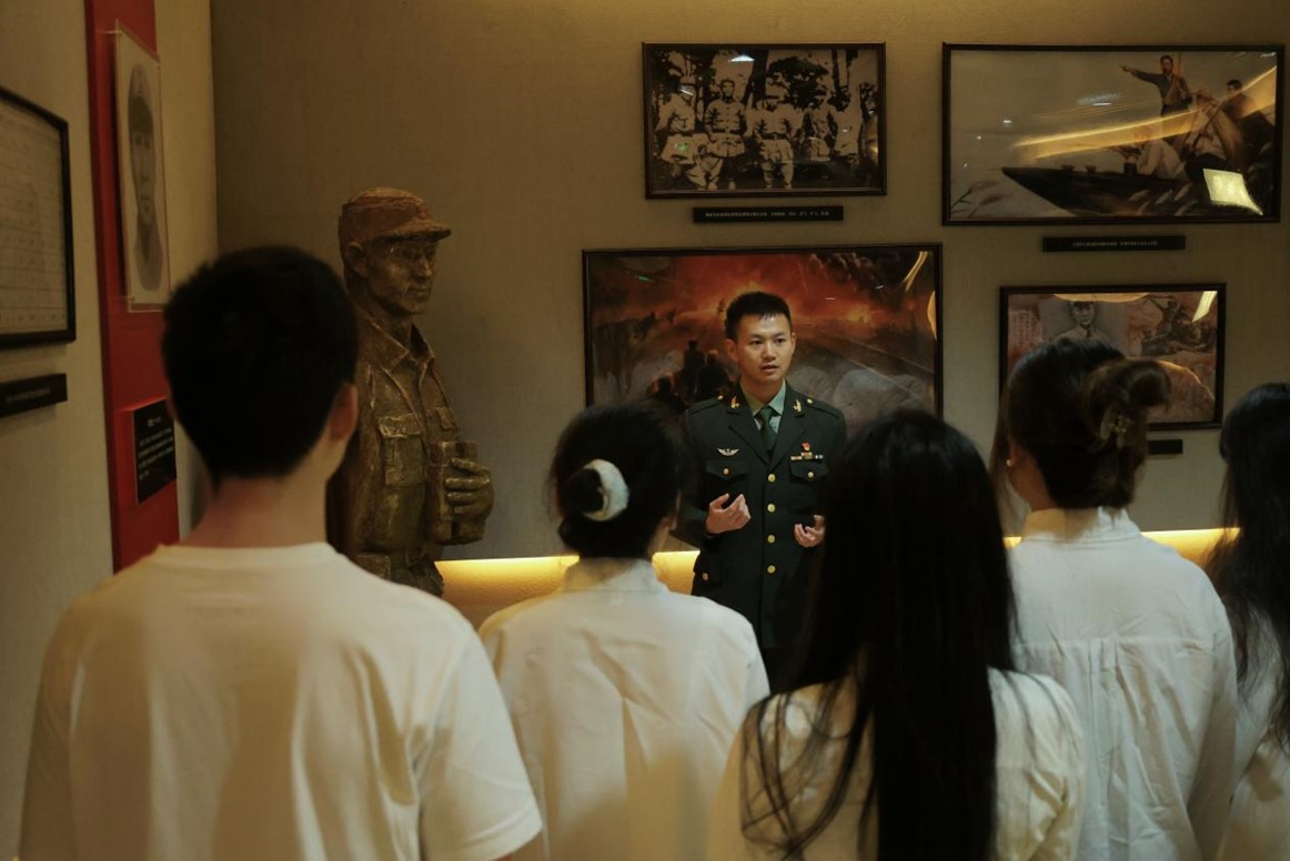 走进纪念馆内,一幅幅历史画卷徐徐展开,大家驻足凝视每一张照片,每一件展品,沉浸式感受着与革命先烈的“跨时空对话”。“正是有军人的坚实守护,才铸就了如今的和谐安宁。”退役大学生士兵汪鹏鹏与大家分享军旅经历,将情感力量传递给同学,使大家产生情感共鸣。