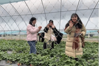 根据活动现场安排,同学们首先来到草莓园进行采摘活动相关调查了解,九池已成为渝东北地区最大的草莓种植基地,为当地经济发展贡献了显著的力量。九池得益于选取优良的草莓品种,采用了先进的种植、播种、培育技术,并且为当地种植果民制定了补贴政策。通过采摘活动的参与,同学们得以近距离观察草莓的生长环境和收获过程。这不仅增强了对乡村旅游的兴趣和认识,还激发了同学们对于可持续农业发展的思考。