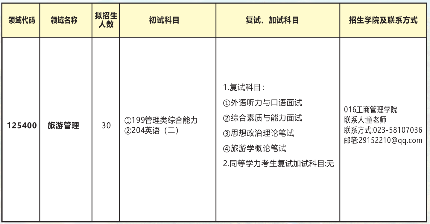 旅游管理硕士(Master of Tourism Administration,MTA)是在我国旅游业迅速发展的大背景下,经国务院学位委员会于2010年3月批准设置的,自2011年开始招收,旨在培养旅游行业的高层次应用型专门人才。重庆三峡学院始建于1956年,现坐落于千年古城、移民之都——重庆市万州区,是三峡库区腹地唯一的一所多科性本科大学,2013年被国务院学位委员会批准为硕士学位授予单位,2021年被批准为博士学位授予单位立项建设高校。
